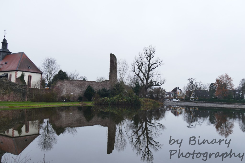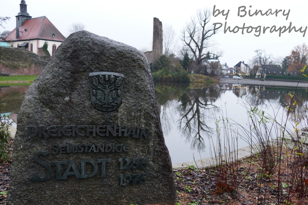 La entrada al pueblo de Dreieichenhain (y eventualmente al mercado) es anunciada con esta piedra que tienen un carácter como muy oficial ja! y enmarca el lago y la torre que están detrás de ella.