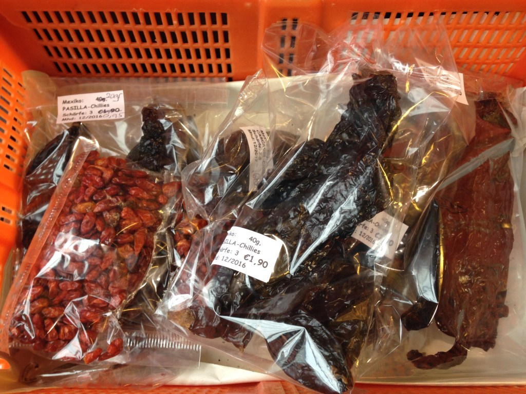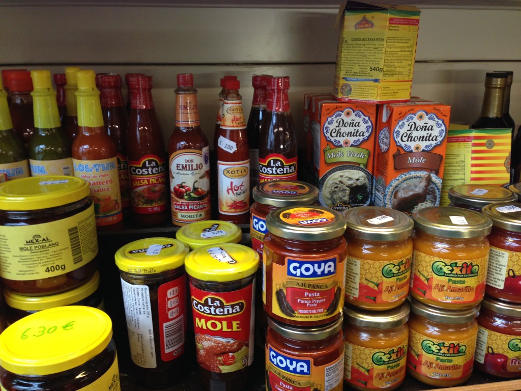 Los artículos que podemos encontrar son muchos pero empezando por los importantes (osea los picantes, jajajaja) tenemos: tajin, valentina (roja y negra), salsa cholula (verde y roja), mexicana, taquera, ranchera y tabasco, chiles en lata como son los jalapenos (verde y rojo), nachos, serranos, poblanos y chipotles, tortillas de harina y de maíz (hechas en Alemania por una mexicana), salsa verde para chilaquiles, mole en pasta de la costeña (mi favorito!) o listo para usarse de la marca Dona Chonita, mole poblano, mole verde y muchos mas productos para enchilarte pero tienen que ir y buscar los que les gusten. O si prefieren hacer su salsa desde cero, puedes comprar chiles secos como pasilla, ancho, rojo, chipotle, etc.