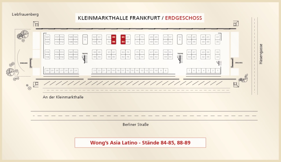 Ya estando allí, váyanse directo a Wong’s Asia Latino que es el local numero 84-85 y 88-89, osea son cuatro locales pero están todos juntos como se ve en el mapa que les pongo aquí. Allí, el amable dueño del cual siempre olvido el nombre, les puede hablar en alemán, inglés y las palabras más comunes en español 🙂 así como los números, por si quieres pagar menos por no entender, jajaja 😉 y con el, pueden comprar muchísimos productos que no soñaron poder tener «on demand» en Alemania. La verdad es que es refrescante poder ir al mercado y escoger lo que te gusta y de repente ver algo y decir «…ahhh, si compro esto, el sábado cocino tal» o «¡ya se me estaba olvidando que ya casi no hay tajin! ¡mejor me llevo otro botecito!» y cosas muy así, como muy mexicanas, jajaja.